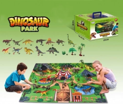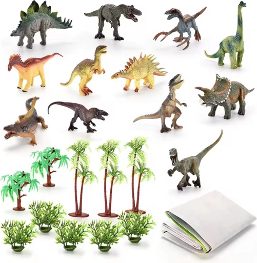- 12 figurines de dinosaures, 10 figurines de plantes/arbres, tapis souple, mallette