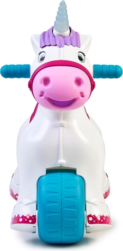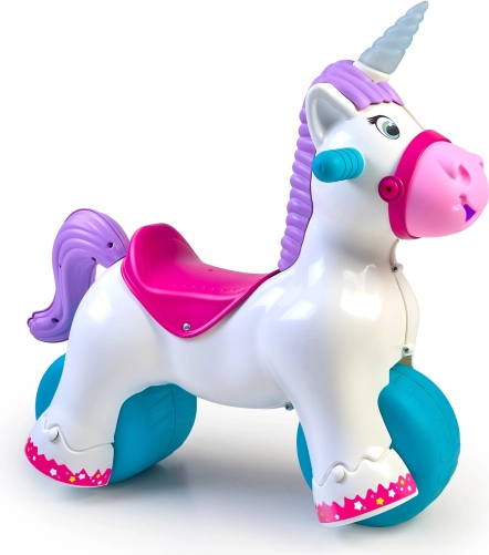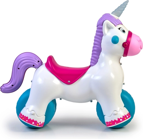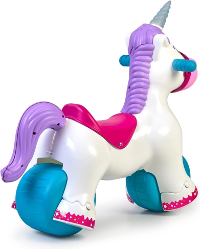 La licorne interactive FEBER évolue avec votre enfant : en un clin d’œil, transformez-la de bascule en porteur. La large base et les grandes roues assurent sécurité et stabilité, la selle ergonomique et les poignées offrent une prise confortable et favorisent une posture naturelle. Idéale pour jouer à l’intérieur comme à l’extérieur.