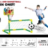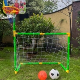 Contenu de l’emballage : cage de football avec filet, panier de basket, ballon de football, ballon de basket, petite pompe.