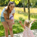 Le pack comprend deux flacons pour la solution à bulles et une sangle, grâce à laquelle l’enfant peut porter le jouet autour du cou et créer des bulles en marchant sans avoir à appuyer sur le bouton. Les effets lumineux et la facilité d’utilisation renforcent l’attrait de ce jouet.