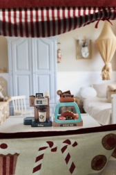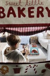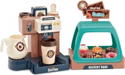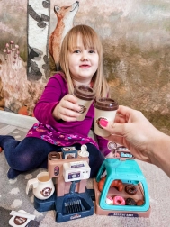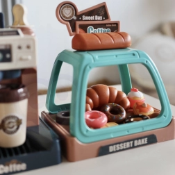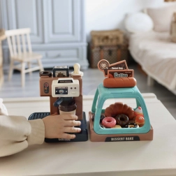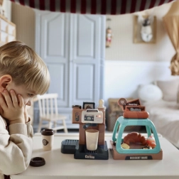Le set de café pour enfants WOOPIE offre une expérience authentique de préparation du café – il suffit de verser de l’eau dans le réservoir, de fixer le levier, de placer le gobelet et le « café » est prêt. Pendant la mouture et l’extraction, des sons réalistes retentissent, une lumière rouge clignote et, une fois terminé, un voyant vert s’allume avec un signal sonore. La vitrine avec donuts, croissants et autres gourmandises complète l’ambiance d’une petite boulangerie.