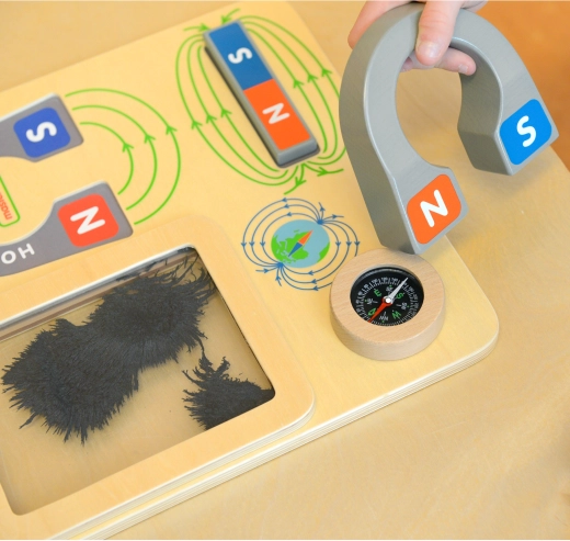 Ce tableau en bois robuste éveille la curiosité et favorise la compréhension des bases de la physique. Les enfants peuvent expérimenter l’attraction et la répulsion des aimants, observer les lignes de champ dans la limaille de fer et explorer les points cardinaux à l’aide de la boussole. Tout est clairement illustré et intégré en toute sécurité au panneau, rendant l’apprentissage lisible et ludique.