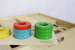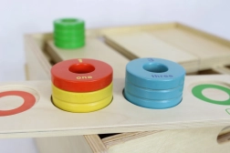 Enfiler et empiler les anneaux sur les picots exerce la prise, la coordination œil–main et la précision des mouvements.