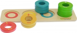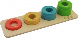 Ce set éducatif en bois allie jeu et apprentissage. Les enfants empilent des anneaux colorés sur des picots, les trient par couleur et par quantité tout en s’exerçant à compter de un à quatre. Chaque anneau est marqué d’un chiffre et d’un mot en anglais, ce qui développe naturellement la sensibilité linguistique.