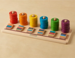 Le jeu avec les anneaux amène les enfants à comprendre l’ordre, la comparaison et le tri par couleur. Créez ensemble des motifs, reproduisez des modèles ou laissez les enfants inventer leurs propres séquences – autant d’activités qui développent naturellement la pensée logique et la représentation spatiale.