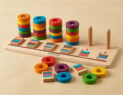 Découvrez un jouet en bois intelligent qui relie jeu et apprentissage. Une base en bois robuste avec des chevilles et un ensemble d’anneaux colorés aide les enfants à reconnaître les couleurs, apprendre à compter et entraîner leurs capacités de coordination. L’espace devant les chevilles est idéal pour insérer des blocs de séquences, offrant de nouveaux défis et prolongeant le temps de concentration.