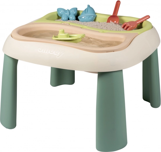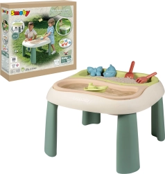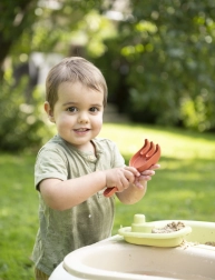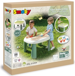 dès 18 mois. Grâce à deux bacs amovibles, les enfants peuvent jouer simultanément avec le sable et l’eau, développer leur créativité et leurs sens. Cette table offre une excellente activité en plein air, alliant écologie et durabilité, et apporte beaucoup de joie aux plus petits. Un choix parfait pour le jardin, le balcon ou la terrasse !