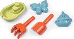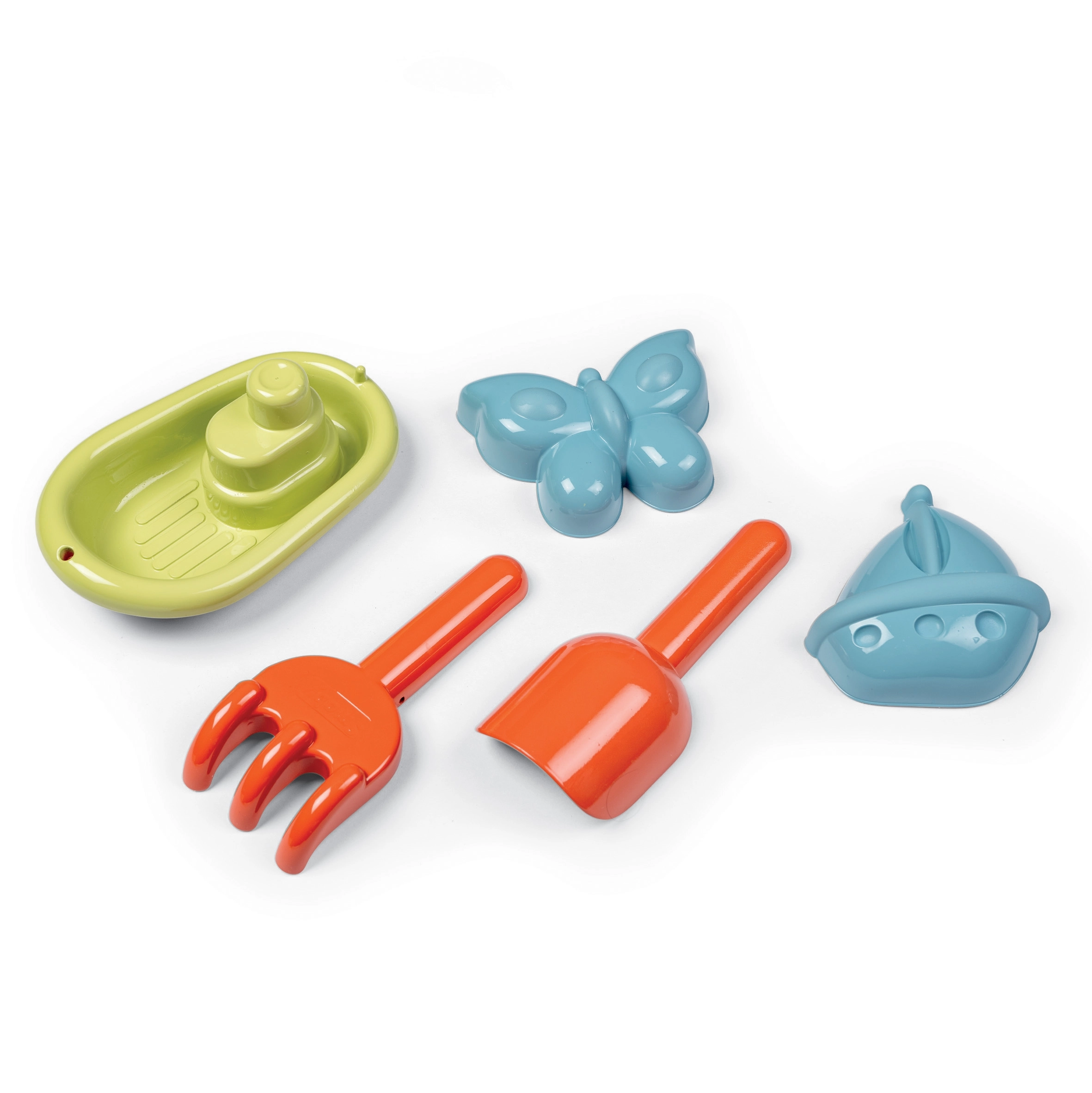 - Riche ensemble d’accessoires – pelle, râteau, petit bateau et deux moules à sable