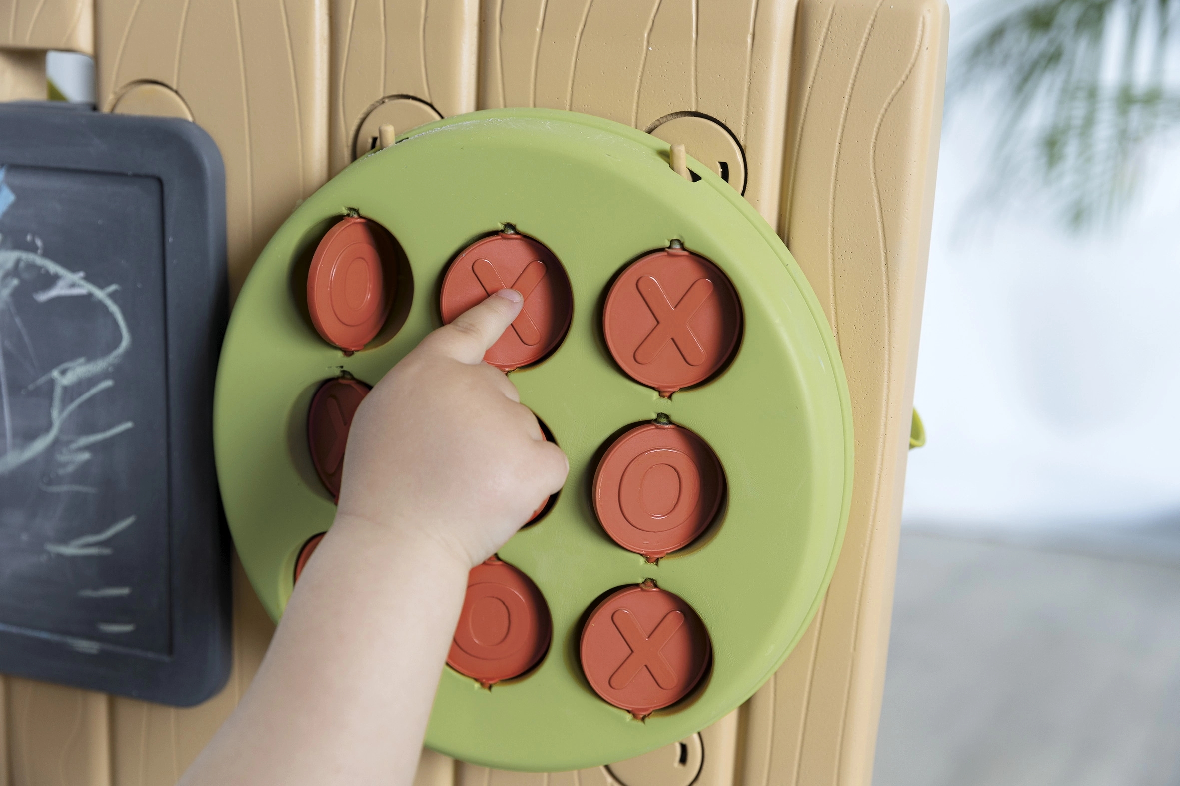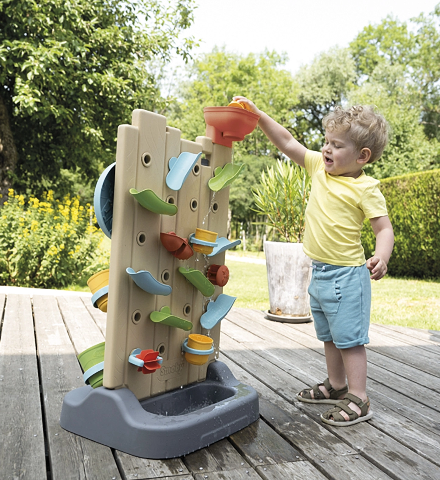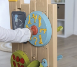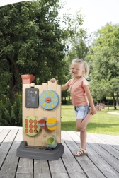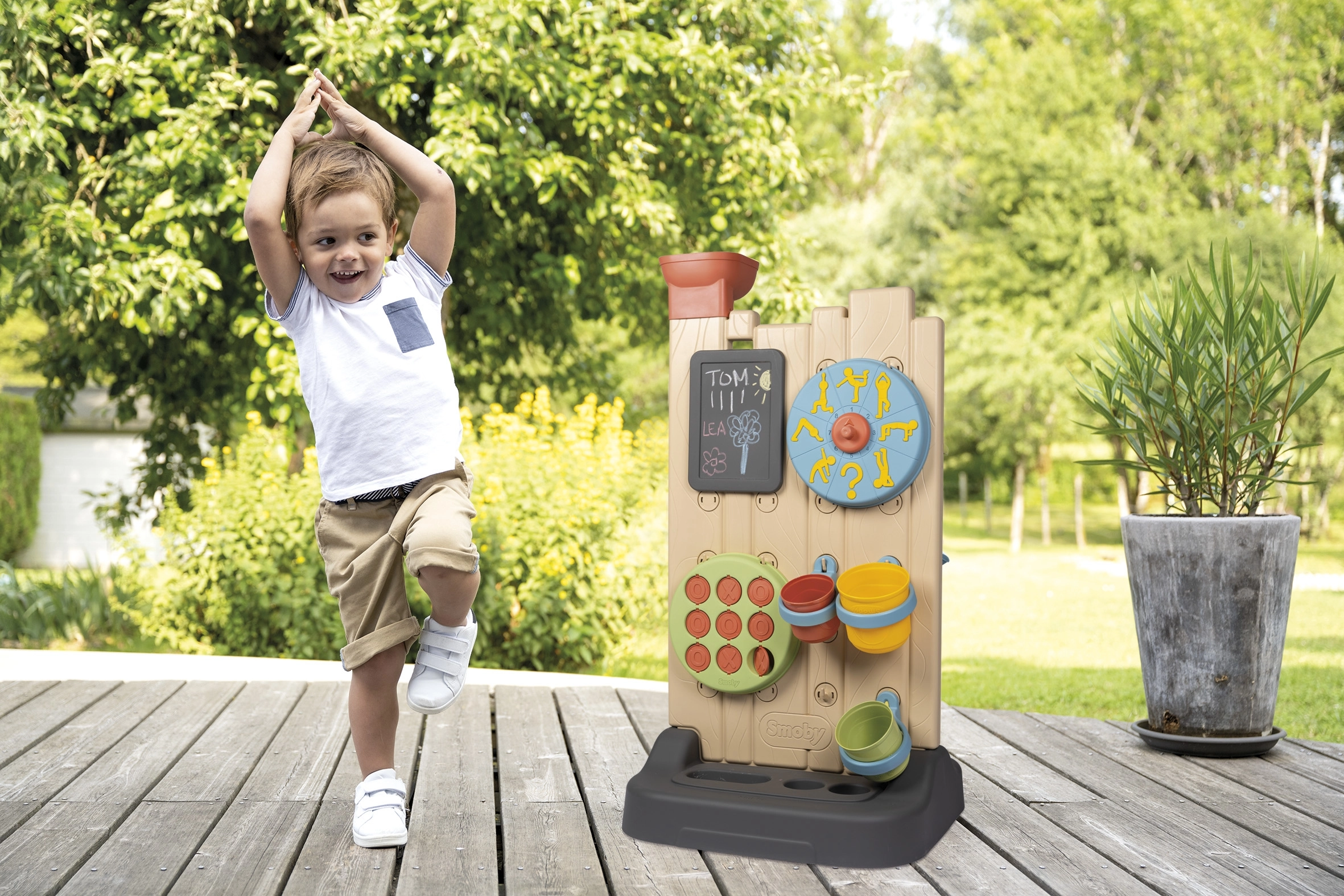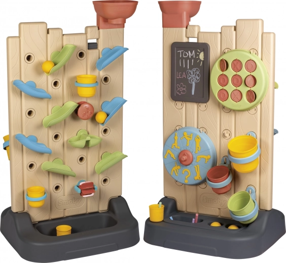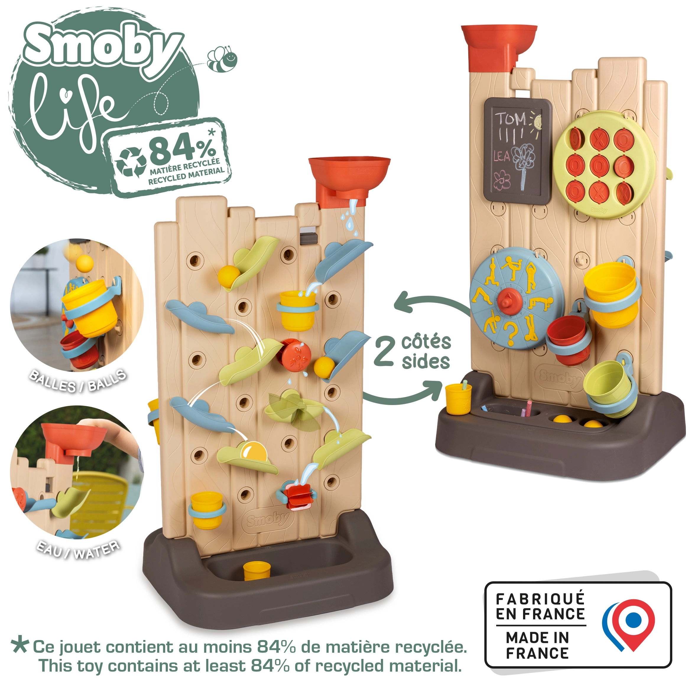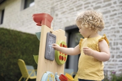 - Comprend 6 activités : jeux d’eau, morpion, tableau à craie, roue sport, lancer de balle et éléments interactifs pour créer ses propres circuits d’eau.