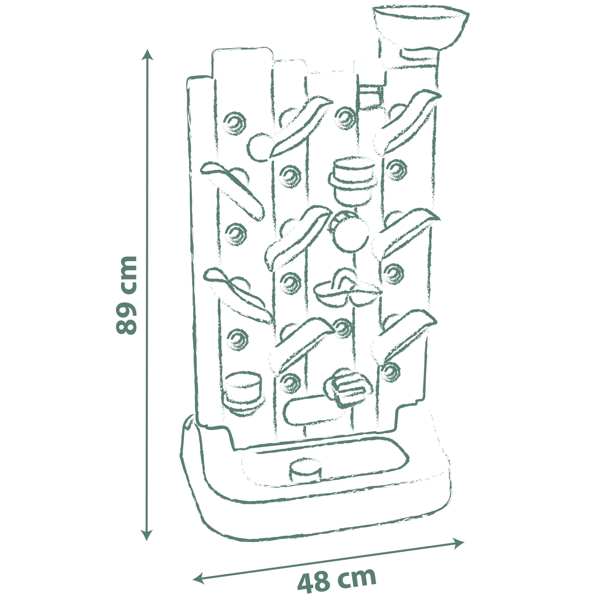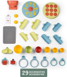 - 29 accessoires inclus, par ex. goulottes, gobelets, roues à aubes, balles, qui inspirent un jeu créatif.