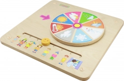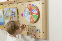Grâce à une roue rotative et à un curseur sur le tableau, les enfants peuvent découvrir différentes conditions météorologiques et ce qu’il est approprié de porter dans ces conditions.