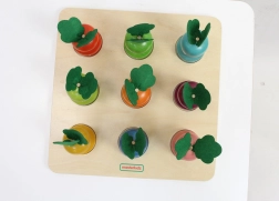 Chaque « morceau de légume » coloré se place à l’endroit correspondant par sa couleur et par le nombre de points (1–9). Les enfants acquièrent naturellement les bases du calcul et de la différenciation des couleurs.
