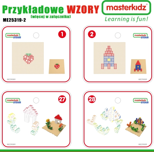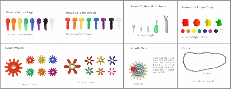- Table éducative, 4 plaques pour briques, 563 briques, 128 chevilles colorées, 128 vis colorées, 64 chevilles géométriques, 2 jeux de 6 outils (clé, tournevis à embouts interchangeables), 18 engrenages, 1 support d'engrenage, chaîne