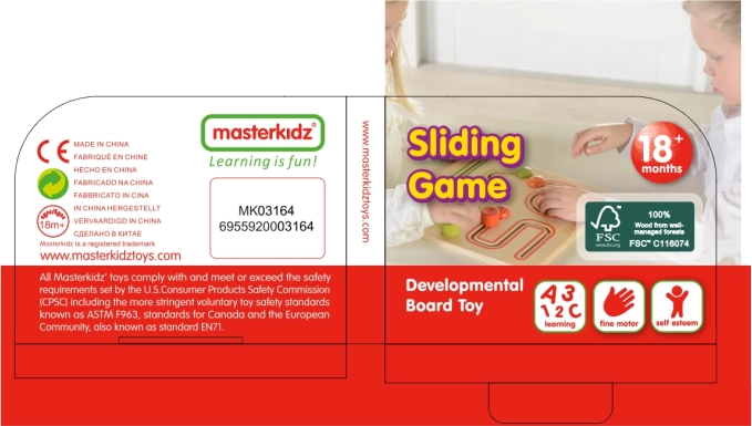 Ce tableau coulissant inspiré de la pédagogie Montessori de MASTERKIDZ favorise l’apprentissage naturel par le jeu. Les enfants déplacent des curseurs colorés le long de quatre types de pistes, entraînant ainsi les mouvements adéquats du poignet et des doigts, indispensables pour l’écriture future. Le matériau en bois stable et finement poncé est agréable au toucher et invite à l’exploration.