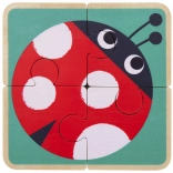 - 6 activités en une : puzzle en bois 4 pièces, chien à tirer sur roulettes, perles à enfiler avec aiguille en bois et pochette, triangle d’activité (trieur, labyrinthe, engrenages, boulier), cubes rotatifs avec images, petit livre illustré « Small and Big ».