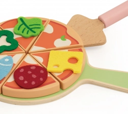 - Pizza en parts, ingrédients en feutrine, pelle/spatule, assiettes et autres accessoires