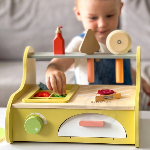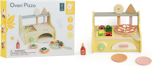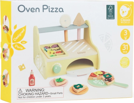 Le four à pizza en bois CLASSIC WORLD est un jouet créatif pour les enfants dès 3 ans qui développe la motricité fine et l’imagination. Il comprend un « four » de cuisson, une pizza avec ingrédients en feutrine amovibles, un bouton rotatif, des assiettes et des accessoires pour le service. En jouant au chef, les enfants exercent le jeu de rôle, la coordination œil-main et découvrent la joie de la préparation de pizza créative.