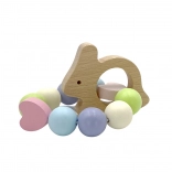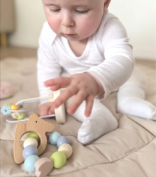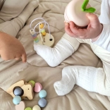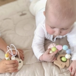 Un lapin coloré rempli de perles attire l’attention des enfants et développe leur ouïe. Idéal pour entraîner les compétences de préhension.