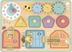 Le tableau comporte des engrenages interactifs que les enfants peuvent tourner, contribuant ainsi au développement de la motricité fine et à la perception des ombres et de la lumière. Un autre élément est l'ensemble de pièces en forme avec des couleurs vives, qui favorise la reconnaissance des formes et la pensée logique.