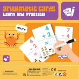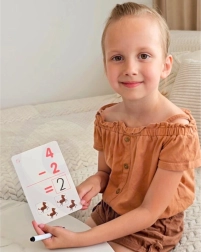 L’ensemble a été conçu pour que l’enfant puisse s’entraîner à compter à plusieurs reprises grâce au feutre effaçable inclus. Les cartes sont divisées entre soustraction et addition. Pour faciliter l’apprentissage, les cartes offrent deux niveaux — on peut commencer par le côté où les exercices mathématiques sont accompagnés d’images, qui peuvent aider l’enfant à trouver le résultat. L’autre côté propose des calculs sans aide visuelle. Grâce à ce modèle d’apprentissage, votre enfant ne ressentira pas la pression de la difficulté d’un nouveau contenu, et résoudre des exercices de mathématiques sera un véritable plaisir ! Pour motiver votre enfant, vous pouvez dessiner un petit cœur dans le coin de la carte après chaque exercice correctement résolu.