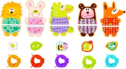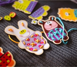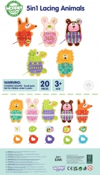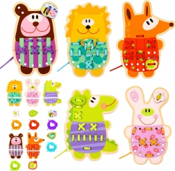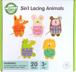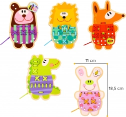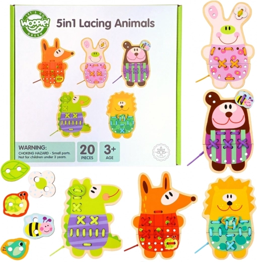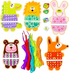 - 5 animaux en bois à lacer, 5 éléments à “coudre”, 5 lacets colorés pour l’enfilage