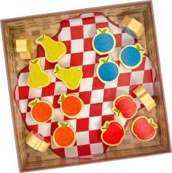 - Lancez le dé : si un fruit apparaît, placez le fruit correspondant dans le panier ; si l’écureuil apparaît, un fruit retourne sur l’arbre.
