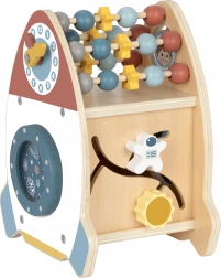 Grâce à diverses activités ludiques, comme un petit labyrinthe ou une horloge réglable, le jouet stimule la pensée créative et la coordination.