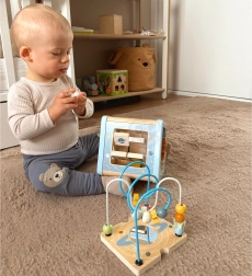 - 5 activités en 1 : labyrinthe à perles, tri des formes, roues dentées, éléments coulissants, images rotatives