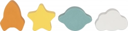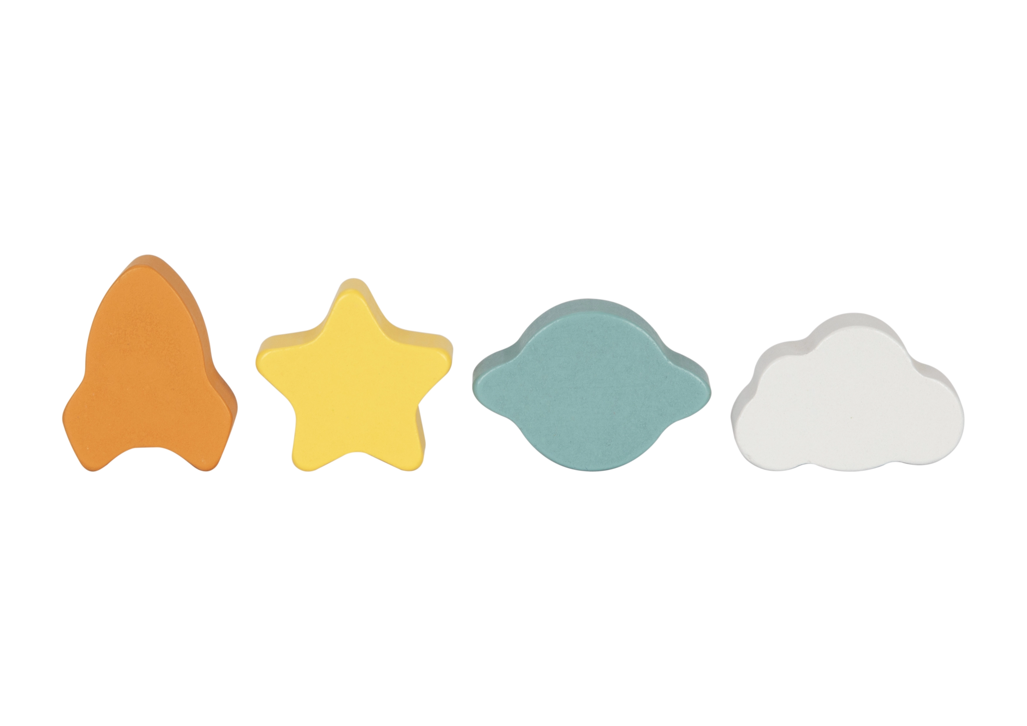 Des ouvertures en forme de planète, étoile, fusée et nuage apprennent aux enfants à reconnaître les formes et les couleurs. L’insertion des pièces renforce la pensée logique et la prise en main.