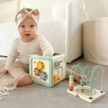 La partie supérieure du cube propose des perles colorées à faire glisser sur des tiges courbées, développant coordination et motricité fine. Le miroir stimule la curiosité et la conscience de soi.