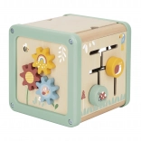 Sur le dessus se trouvent un labyrinthe de perles et un miroir sécurisé, et sur les côtés un trieur de formes, des petits cubes rotatifs avec animaux, des roues dentées et des rails coulissants. Chaque panneau apporte un type de défi différent, permettant à l’enfant d’exercer patience, créativité et résolution de problèmes.