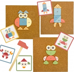 Set complet avec formes en bois, petits clous, marteau et plaque de liège. Les enfants peuvent suivre les modèles ou laisser libre cours à leur imagination.
