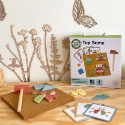 Le set comprend 30 pièces en bois, 40 petits clous, un marteau en bois, une plaque de liège et 10 cartes recto-verso avec 20 motifs répartis en 3 niveaux de difficulté. Un excellent choix pour développer la motricité fine, la coordination œil-main et la vision spatiale.