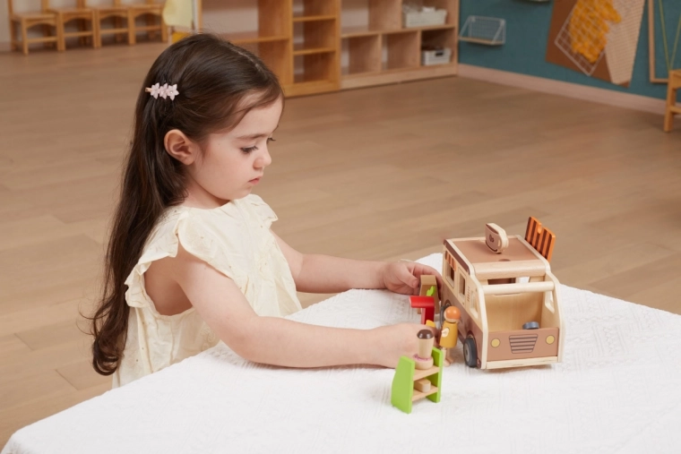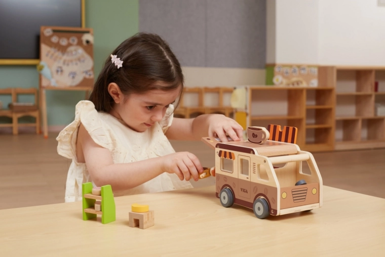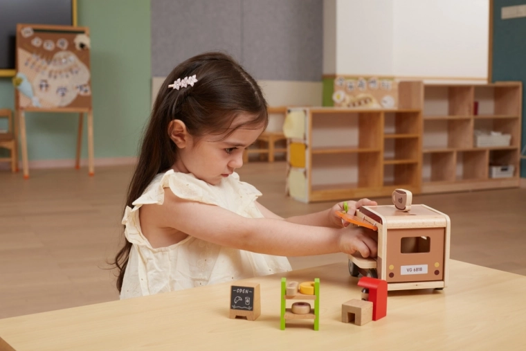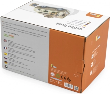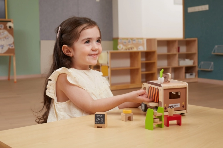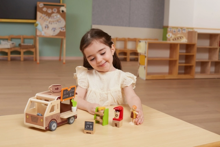 Le camion-café en bois pour enfants VIGA est un jouet bien pensé pour les petits adeptes du jeu de rôle. Inclus : figurine de barista, étagère avec gourmandises, friandises et équipement allant du café à l’ardoise de menu. Grâce au toit relevable, à la fenêtre de service et au coffre ouvrant, le jeu est fluide et imite le service réel des clients.