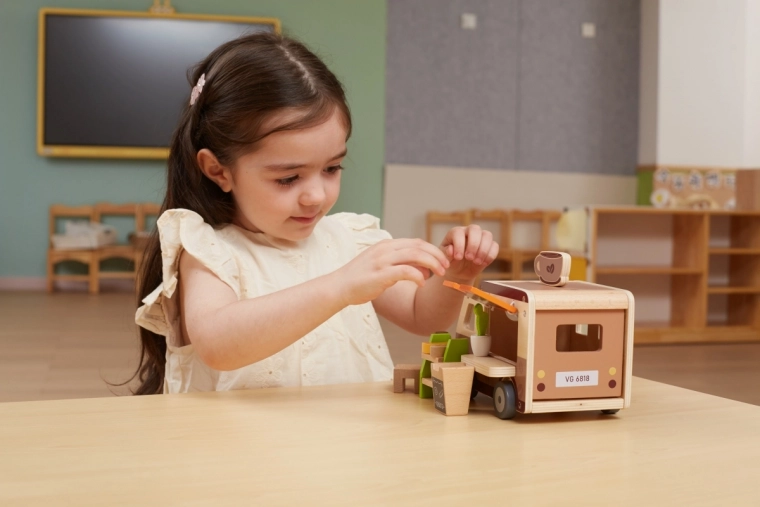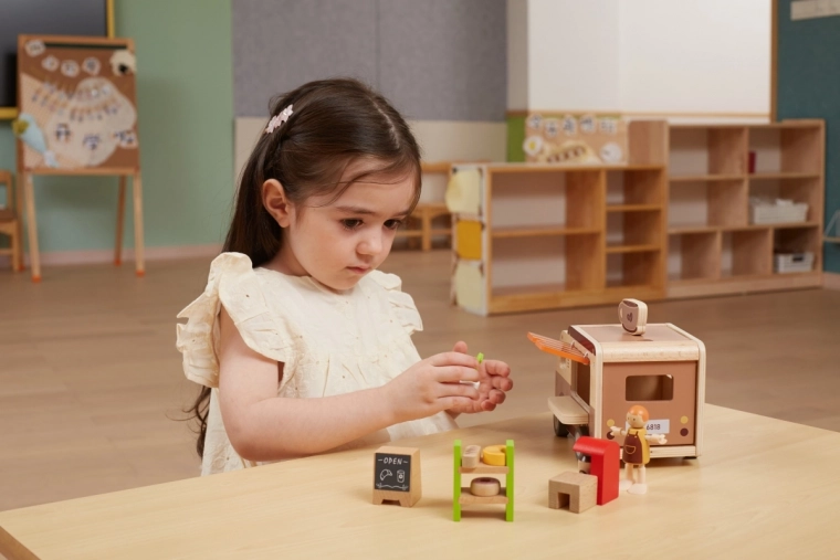 Le bois massif de qualité et les finitions sûres assurent une longue durée de vie même en usage quotidien. Le set favorise l’interaction sociale, la communication et l’imagination – les enfants peuvent « préparer du café », vendre des pâtisseries et créer leurs propres histoires de café.