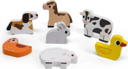 L’ensemble comprend 7 adorables animaux – une poule, un mouton, un cheval, un lapin, un caneton, un chien et une vache. Grâce à l’épaisseur accrue des pièces, les enfants les manipulent facilement et peuvent les utiliser hors du plateau comme figurines indépendantes pour des jeux imaginatifs.