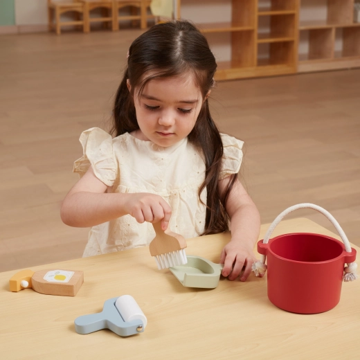 • Équipement complet pour jouer au ménage : balai/balayette avec pelle, pulvérisateur en bois, rouleau ramasse-saletés et seau rouge.