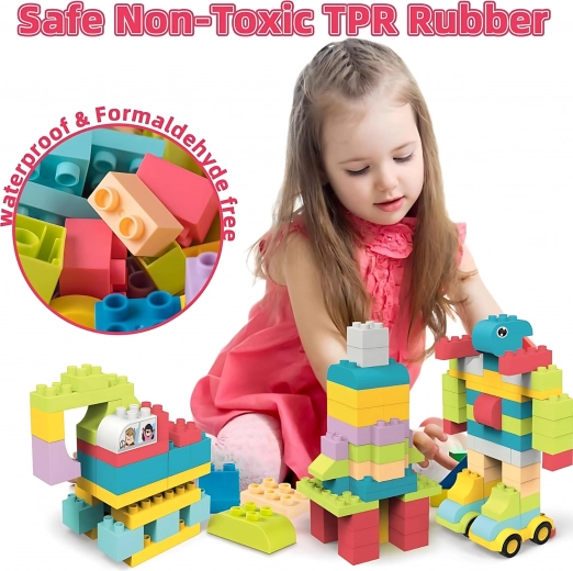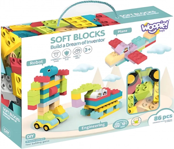 Le kit de construction WOOPIE contient 86 pièces qui se connectent facilement et permettent aux enfants de créer diverses constructions 3D telles que des voitures, des avions ou des animaux. Les briques sont grandes et douces, ce qui assure leur sécurité pendant le jeu, et peuvent être ébouillantées à 120 degrés pour un entretien facile.