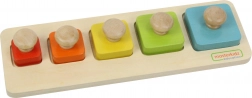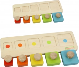 Jouet éducatif en bois inspiré de la méthode Montessori, idéal pour développer la motricité fine, les capacités sensorielles et la coordination main-œil chez les enfants. Il se compose de cinq blocs carrés de différentes couleurs et tailles que l’enfant insère dans les emplacements correspondants sur une base double face : une face comporte des points colorés pour faciliter l’appariement, l’autre uniquement des ouvertures découpées pour augmenter la difficulté.