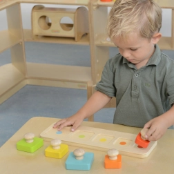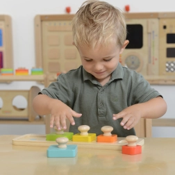 Les blocs en bois et les ouvertures découpées favorisent le travail précis des mains et des yeux, que les enfants exercent en insérant les pièces.
