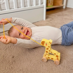 En tirant sur la ficelle, la girafe roule en douceur et motive les enfants à se déplacer de manière autonome, tout en développant l’équilibre et la coordination œil–main.