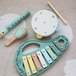 Le set comprend un xylophone, un tambourin, une flûte à bec, une castagnette et une baguette – une combinaison idéale pour découvrir rythmes et sons dès 18 mois.