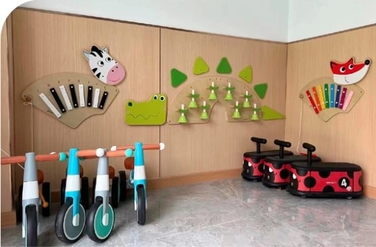 Le design mural économise de l’espace et crée une zone attrayante pour le jeu collectif et le développement de l’éducation musicale.