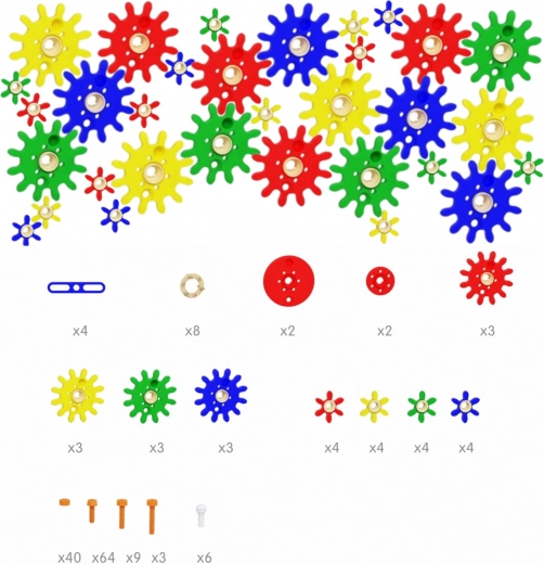 - 34× engrenage, 4× poulie, 1× chaîne pour engrenages, 2× courroie d’entraînement pour poulies, 6× cheville blanche, 76× vis (3 tailles), 40× écrou, 16× support en L, 4× support plat, 2× panneau STEM perforé, 1× moulin à vent, 3× tournevis manuel