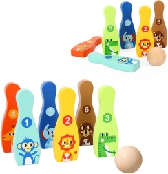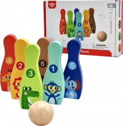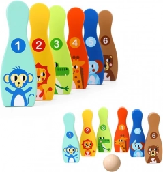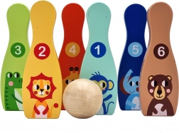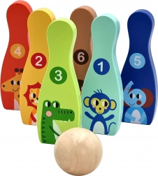 Le set de bowling en bois avec six quilles colorées et une balle est un jeu idéal pour la chambre d’enfant. Chaque quille comporte un motif animalier et une numérotation 1–6, permettant aux enfants d’entraîner naturellement le comptage, la reconnaissance des couleurs et de développer leurs compétences motrices en jouant.