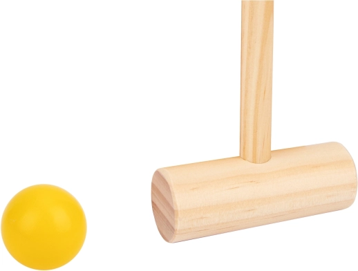 Le coffret comprend 4 maillets en bois, 4 boules colorées, 6 arceaux métalliques, 4 piquets d’extrémité et un sac – tout prêt pour jouer immédiatement.