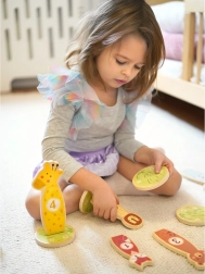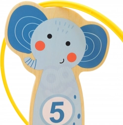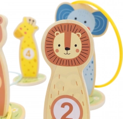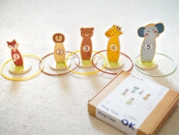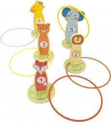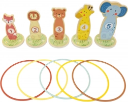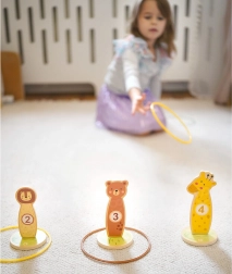 Chaque cible animale possède un numéro – en lançant les anneaux, les enfants entraînent leur concentration, la coordination œil-main et s’exercent en même temps au comptage des points de manière ludique.