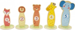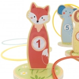 Ce jeu de lancer d’anneaux en bois avec de charmants animaux (renard, ours, lion, girafe et éléphant) apprend aux enfants à viser la cible, développe la motricité fine et la concentration. Chaque cible est numérotée – l’enfant apprend ainsi naturellement à compter les points et à planifier ses prochains lancers. Les pièces peuvent être disposées librement pour modifier facilement la difficulté.