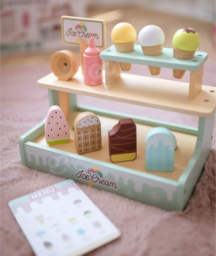 Découvrez la magie du jeu de marchande avec le stand de crème glacée WOOPIE GREEN au style soigné. Les enfants peuvent servir des glaces en boules ou sur bâtonnet, composer les saveurs grâce aux boules magnétiques et choisir depuis le menu. Le jeu développe la coordination œil‑main, la créativité et les compétences sociales lors du service des clients.