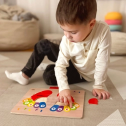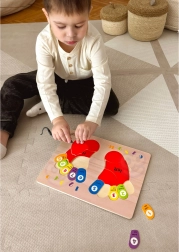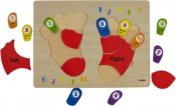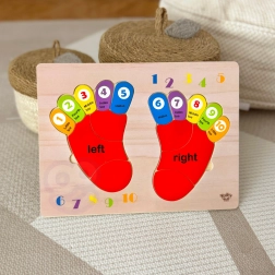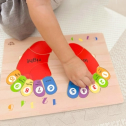 Le puzzle en bois de la marque TOOKY TOY est un accessoire idéal pour les enfants lors de leurs premiers pas dans le monde des mathématiques. Le tableau et tous ses éléments sont fabriqués en bois de haute qualité et sont parfaitement adaptés à la taille des pieds des enfants. Les empreintes colorées sont marquées des côtés : gauche et droit, et chaque doigt est associé à un chiffre, ce qui aide les enfants à transférer les connaissances apprises pour compter sur leurs propres doigts.